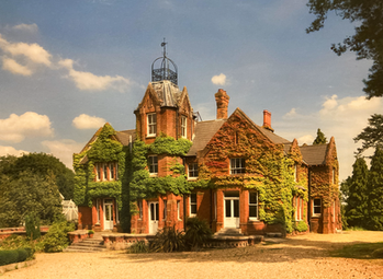 '1868. Large, of dark red brick, in a style perhaps fondly imagined to be Elizabethan. A square tower with gables on four faces, topped with a wrought-iron gazebo. On the north side of the house, a fine free-standing [orangery] with transepts, clerestory, and central turret.'